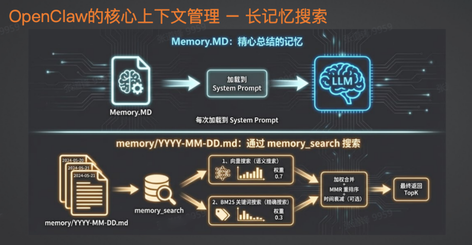 - 第二层是系统内置的 memory search 工具,结合向量索引和关键词索引进行混合搜索