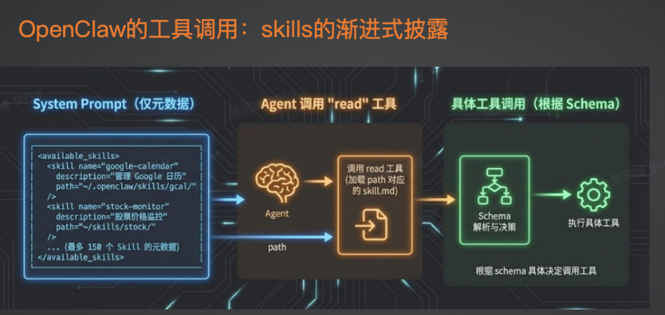 OpenClaw 使用标准的 skills 渐进式披露方式来调用各种工具。